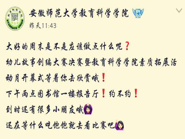活动开始前,学生会工作人员通过开通QQ、微信、微博等平台,发布了关于幼儿故事创编大赛的消息,吸引了同学们的积极报名参加。并且加大了宣传力度,在不同的平台推送相关的活动进度同时,在活动开展前,文艺部工作人员也通知各班文娱委员在班级内进行宣传和推广进行预热并鼓励同学们积极参与进来,使本次活动在还未举办之前就已经引人入胜。