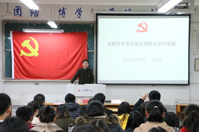 最后,刘晓宇以“高校学生党员的先进性认识与实践”为题,为学员们做了第一讲的理论授课。他结合大学生实际情况,从深刻认识新时期“保持党的先进性是党的生命”的极端重要性、如何实践高校党员先进性、学生党员及其先进性等三个方面带领学员共同学习。强调作为一名学生党员,我们要做好模范带头、桥梁纽带、助手表率、组织凝聚的角色定位,时刻跟进时代潮流,保持好大学生党员的先进性。