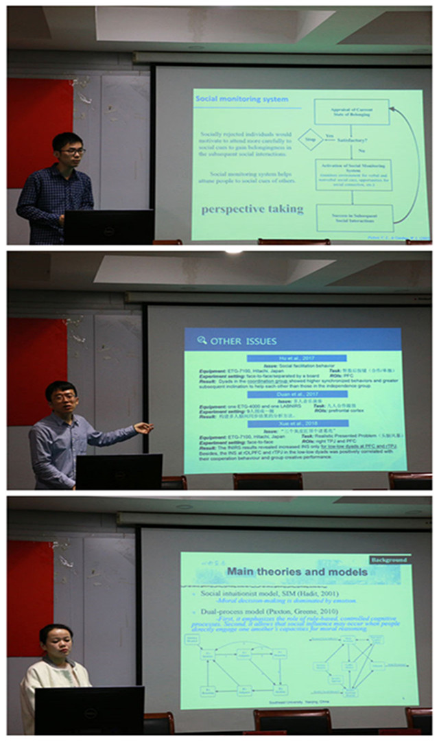 李明明博士围绕主题“ 近红外超扫描技术的发展与应用”畅谈了近红外技术发展与应用两大主题,洞察到相比功能性磁共振扫描,事件相关电位等当今主流的脑扫描技术,近红外技术(Functional Near Infrared Spectroscopy)作为一项心理学技术的“新起之秀”,能够在同一时间方便有效地采集多人的扫描数据,探析人们社会互动过程中的脑同步现象。结合其成本控制、长期测量、装备携带等独特优势,李博士从社会交互、合作竞争、学生教学交互、亲子交互、社会决定等方向提供了较为全面的研究视角。彭苏浩博士则以“社会排斥影响视觉观点采择加工的电生理基础”为中心介绍了其研究方向“社会排斥”的最新进展,从神经科学角度探究视觉观点采择的电生理基础,汇报中一系列逻辑缜密,设计精巧的实验方案给同学们带来了极大的启发。紧接着陶丹就内隐与外显道德加工的差异为主题进行汇报,特别指出当今道德加工研究中对内隐道德加工领域的研究匮乏,并对未来该领域的研究进行了展望。