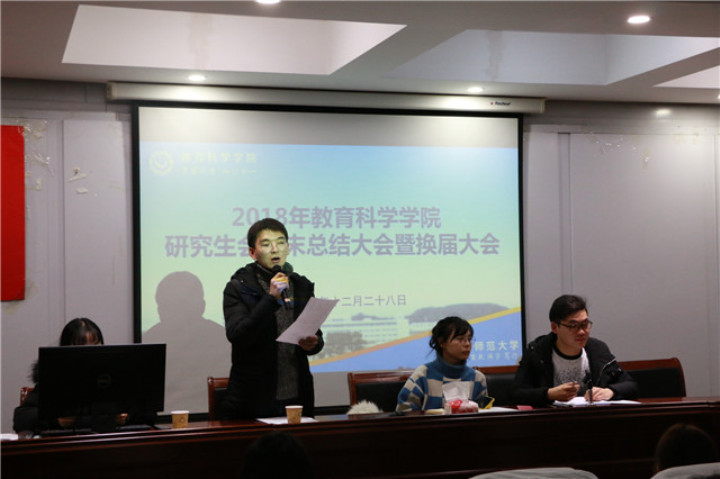 上届研会主席王申振对一年来的研会工作进行总结报告,鼓励新成员积极进取,开拓创新。新一届研会主席王清涛围绕制度建设、主动担当、自身定位三方面对新一届研会工作做出规划,并承诺从自身做起,努力将研会打造成一个优秀的学生干部团体。紧接着,叶老师根据自己学生时期参与研究生会的经历同全体研会成员进行了一番亲切的交流,并就如何处理好工作与学习的关系这一问题给予切实可行的指导。随后,副主席吴锋宣读研会考核及考勤制度,并进行解读。主席团代表房聪做工作总结,并宣读本学期研会提干人员和优秀部员名单。
