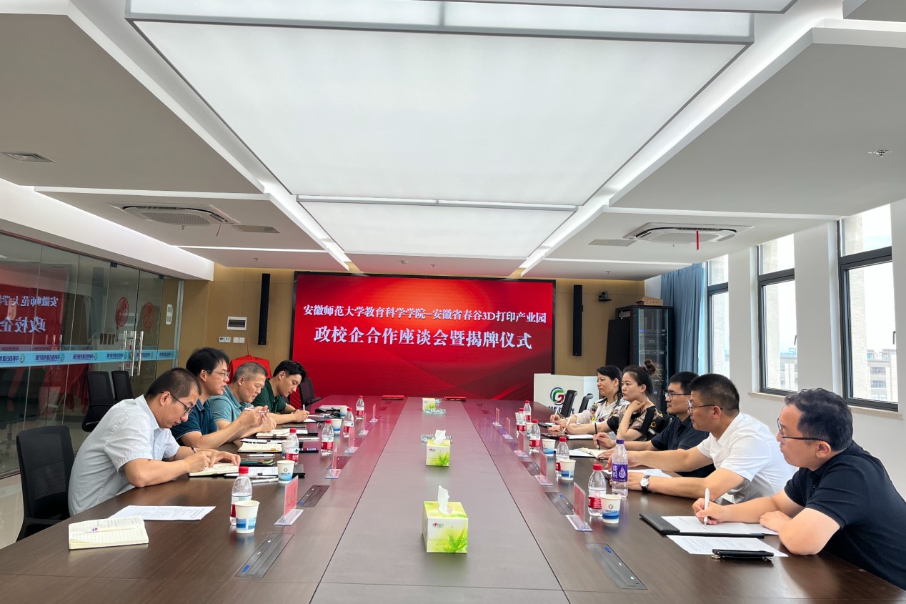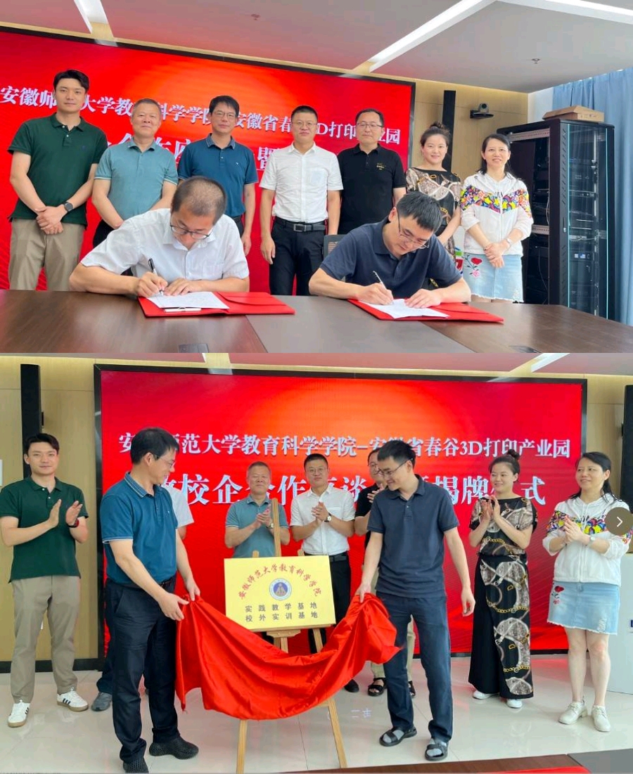 (本网讯 教科院 张帅)为深化产教融合、政校企合作发展,6月21日,在副院长韩建涛的带领下,教育技术专业负责人肖文、课程负责人张帅、实验室中心主任席鹏、骨干教师陶佳一行前往芜湖春谷3D打印智能装备产业园洽谈,并举办了实践教学基地、校外实训基地的揭牌仪式。