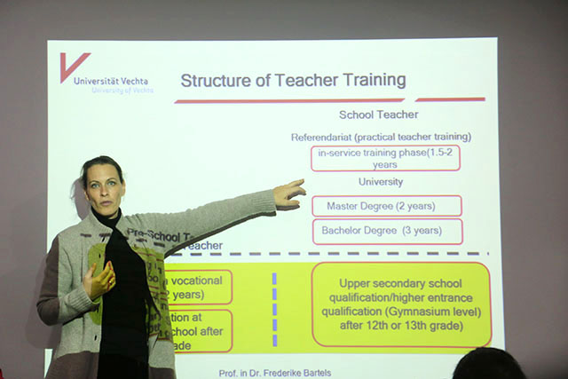 图/王红)12月11日上午,德国费希塔大学Frederike Barrtels教授、Melanie kubandt教授应邀在我院三楼学术交流中心开展主题为“德国教师教育及其课程设置”、“德国儿童早期教育”的学术交流活动。报告由我院资深翻译、博士叶旭萍主持,院长桑青松、学前教育专业张更立教授、王路曦副教授以及教育学专业研究生到场聆听交流。