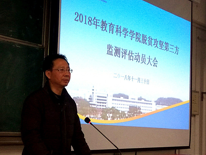 本网讯 (教科院 文/刘洪钰图/叶方舟)为顺利开展安徽省脱贫攻坚第三方测评工作,我院于11月30日下午在田楼8102教室召开2018年安徽省脱贫攻坚第三方监测评估动员大会,院研究生教务员叶方舟、2017级研究生辅导员王礼军以及103名研究生与会,学院党委书记方泓作动员讲话。