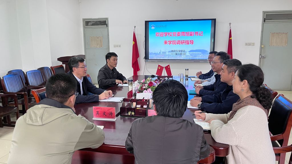 (教科院 袁黎平)10月9日下午,校党委副书记周旭到教科院调研指导工作。校办公室副主任戴和圣、学院领导班子参加调研会。会议由学院党委书记方泓主持。