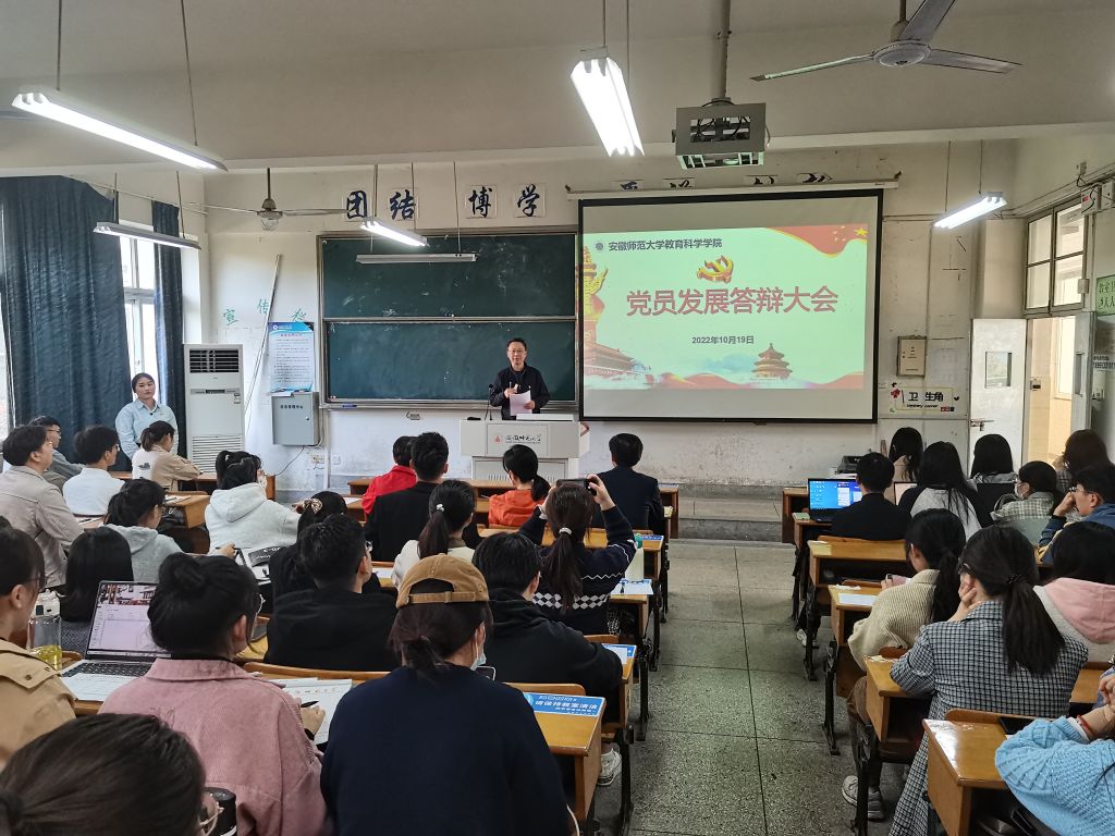 教科院四个研究生党支部于2022年10月19日下午集中举行党员发展答辩,学院党委书记方泓、组织员兼党委秘书袁黎平、教育技术学研究生党支部副书记丁晓云、教育学研究生党支部副书记王礼军、研究生党支部全体党员、入党积极分子代表参加答辩大会,会议由教育技术学研究生党支部书记王曼婷主持。