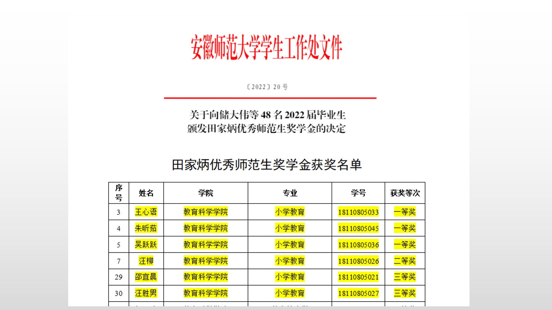 学生专业基础扎实,教学技能过硬,在历次大赛中成绩优异。自2019年开始,该专业组织学生参加安徽省高等学校师范生教学技能大赛、长三角师范生基本功大赛、全国科学教育专业师范生教学技能创新大赛、全国大学生英语竞赛、全国大学生数学竞赛等。近三年来,该专业学生在这些比赛中获奖达41人次,其中一等奖(冠军)9人次,二等奖(亚军)15人次,三等奖17人次。另外,在我校近日公布的48名田家炳优秀师范生奖学金获得者中,该专业2022届毕业生就有6名学生获奖,其中一等奖3名,占全校一等奖的一半,二等奖2名,三等奖1名。