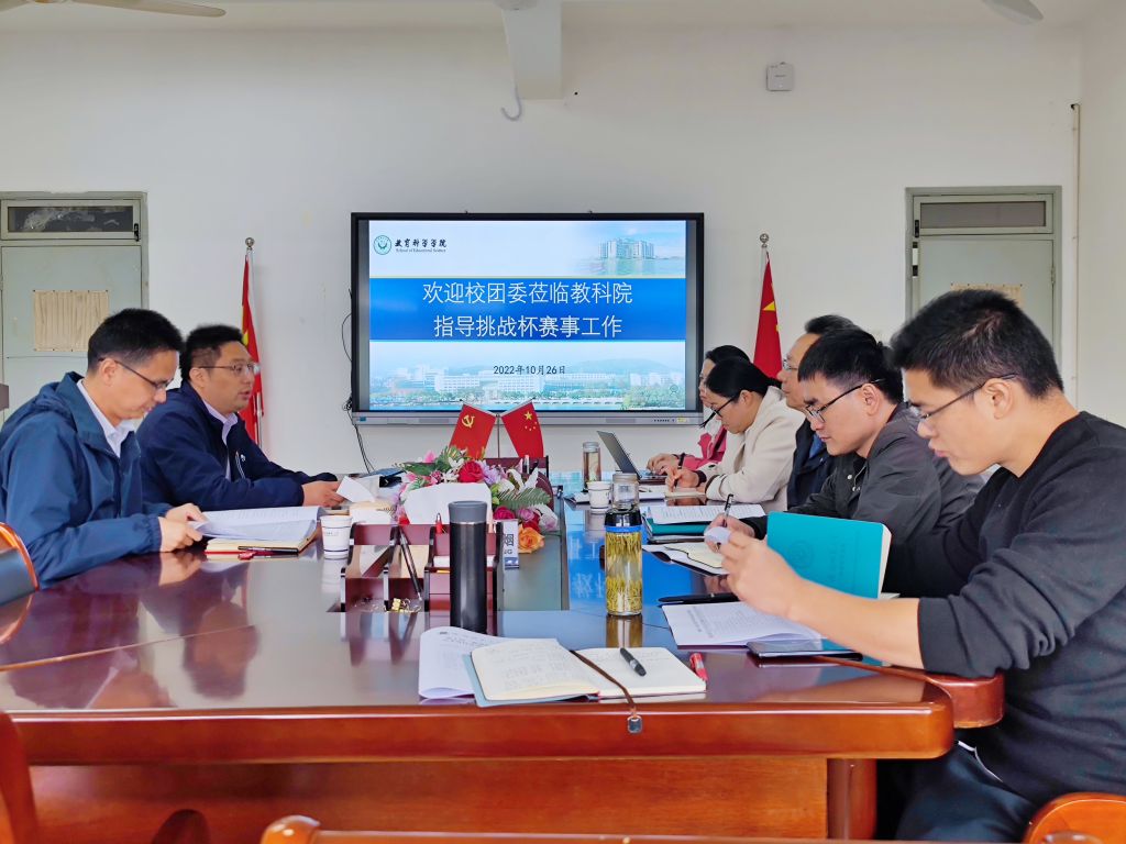 2022年10月26日上午,校团委书记、大学生艺术教育中心主任汪凯、校团委副书记廖仲明到365英国上市官网调研指导“挑战杯”赛事工作。院党委书记方泓、党委副书记杜凤、副院长韩建涛、副院长吴文涛、副教授陶佳、院团委书记张理强参加了会议。