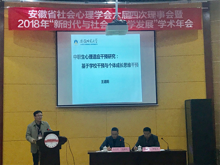 袁芳琦)2018年11月17日安徽社会心理学会六届四次理事会暨2018年“新时代与社会心理学发展”学术年会在合肥工业大学宣城校区召开,合肥工业大学副校长陈鸿海、宣城市委宣传部常务副部长郑华、铜陵学院副校长夏美武、安徽社会心理学大会会长范和生教授以及学会理事、会员300余人参加本次学术会议,我院心理学专业王道阳副教授携5名研究生参加了此次会议。