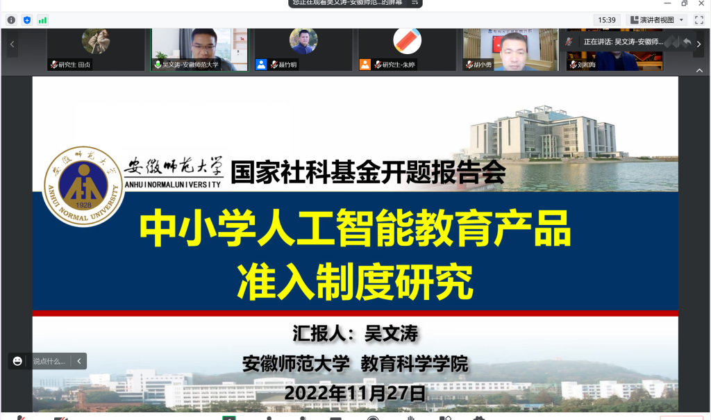 2022年11月27日上午,国家社科基金2022年度课题开题报告会如期举办,由于疫情防控需要,本次开题报告会采用线上形式进行。此次开题的是吴文涛副教授主持的国家社科基金青年项目“中小学人工智能教育产品准入制度研究”( 课题编号22CGL045)。学院特邀华中师范大学人工智能学部副部长、国家数字化学习工程技术研究中心常务副主任刘三女牙教授,西北师范大学教育技术学院院长郭炯教授,华南师范大学教育人工智能研究院常务副院长胡小勇教授,教育部教育技术与资源发展中心研究员宋灵青,安徽师范大学刘和海教授组成评议专家组,科大讯飞教育技术研究院副院长王亚飞,课题组成员杨滨教授、白倩副教授、吴钦金老师以及学院部分师生参加了开题报告会。开题报告会由校网络安全与信息化办公室副主任聂竹明教授主持。