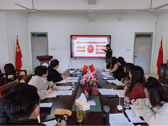会上,全体参会人员共同视频学习《李强总理答记者问》,2019级辅导员莫大贡领学2023年全国两会政府工作报告要点,杜凤传达了学校“新春第一会”的会议精神。杜凤指出,全体辅导员要深入学习贯彻全国两会精神,认真领会和准确把握政府工作报告的丰富内涵,围绕学校工作要求,紧密结合学院学团工作,将学生日常思想教育管理服务做细做实。