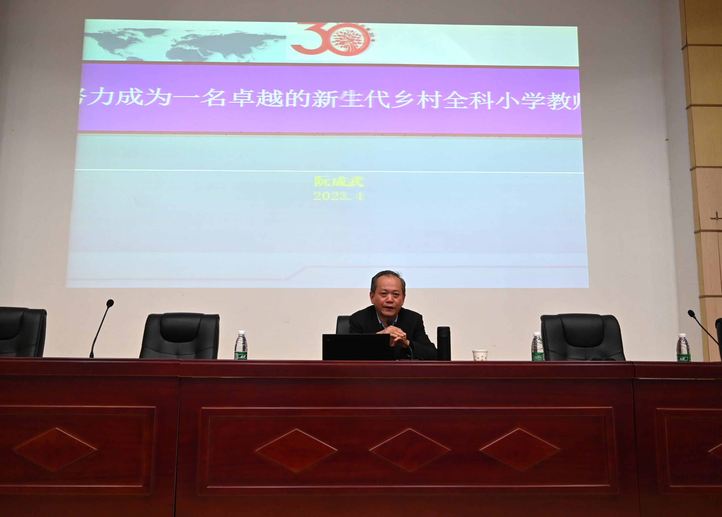 4月26日下午,小学教育专业特别邀请365英国上市官网二级教授、博士生导师阮成武老师做客“三名”讲坛,在科技小礼堂给小学教育(全科型)专业全体学生开展了题为“努力成为一名卓越的新生代乡村全科小学教师”的专场报告。莅临本次报告的有小学教育(全科型)专业负责人王芳老师和谈力群、马兴、闵韡、位涛、杨俊铨等任课老师,小学教育(全科型)专业全体本科生到场参加,2020级小学教育张琦同学主持本次报告会。