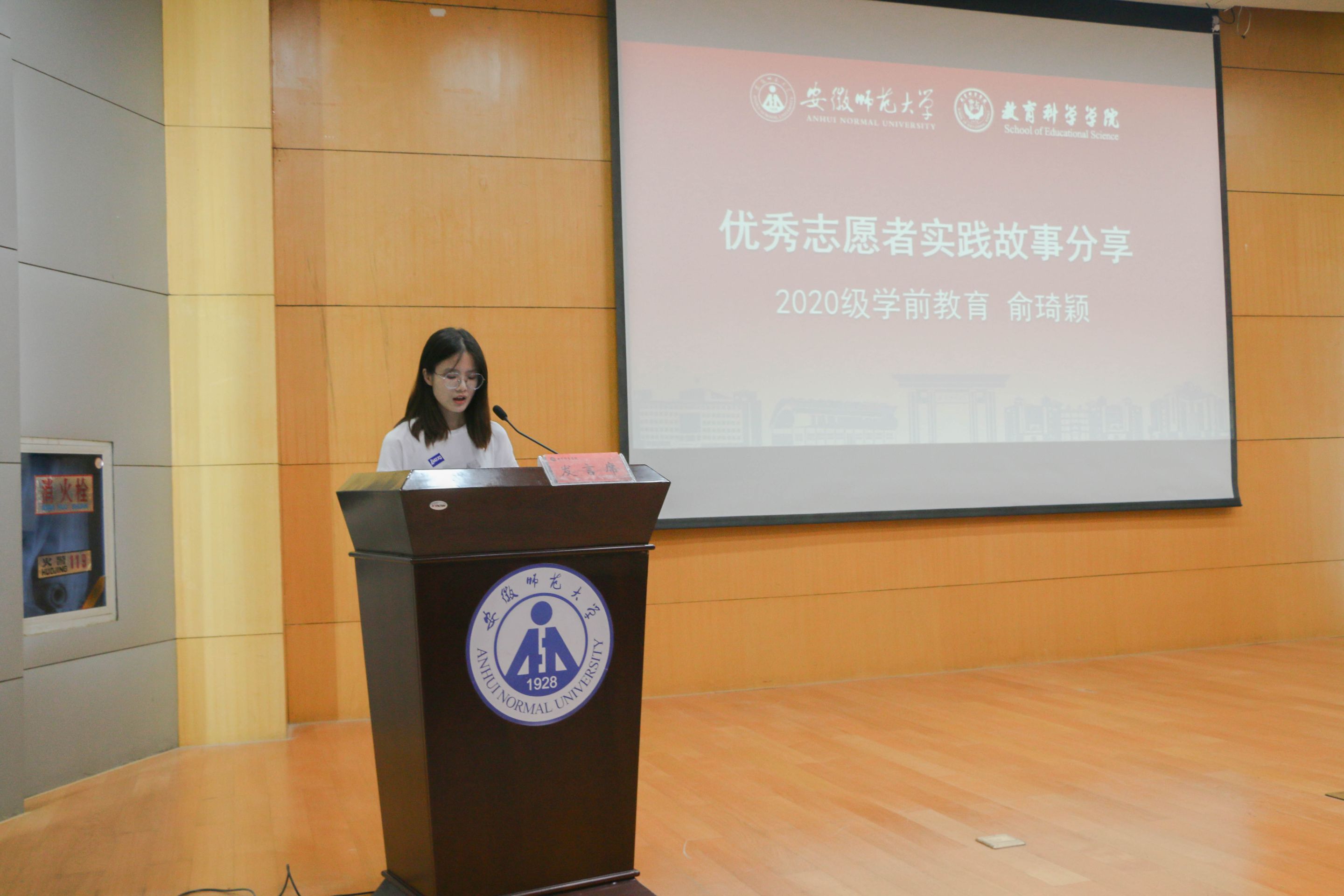 2020级学前教育专业本科生俞琦颖作为暑期社会实践优秀志愿者分享了她在和县的实践故事,并表示只有贴近实际、了解实际,才能发挥大学生人才优势,服务于社会建设。2021级教育学专业本科生孙宇作为校级重点团队代表做出承诺,将珍惜实践机会,以青春投身社会,用实践增长才干。