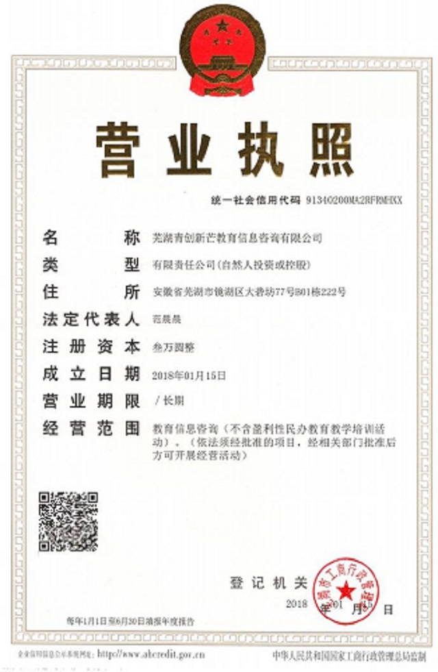 本网讯 (教科院 濮楠楠 魏良)为培养大学生创新意识、启迪创意思维、提升创造能力、造就创业人才,深入推进国家创新创业理念,经学院领导的正确领导,专业教师的精心指导,团队成员的共同努力,我院首个大学生创业公司“芜湖青创新芒教育信息咨询有限公司”(以下简称青创新芒公司)于2018年1月15日取得营业执照,落户于安徽省芜湖市镜湖区大砻坊创业产业园。