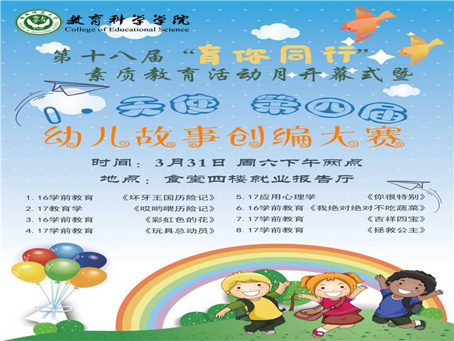 本网讯(教科院 徐翔)为了提高教科学子的综合素质,实现一二课堂联动育人,3月31日下午,我院隆重举办第十八届素质教育活动月开幕式暨第四届“I·天使”幼儿故事创编大赛。本次活动邀请了市实验幼儿园陈璐老师、弋江区薪火服务中心负责人王旸、院党委副书记张如华及学前教育负责人张更立担任评委。学院各年级辅导员、学前专业所有学生参加了本次活动。为了提高比赛的针对性和趣味性,更是邀请了十余名小朋友担任大众评审。