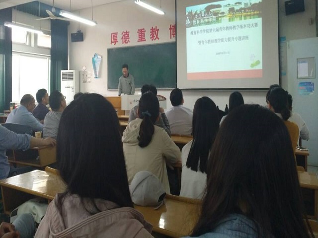 本网讯(教科院 余露)4月11日下午,学院在赭山校区8401教室举行了院第六届青年教师教学基本功大赛暨青年教师教学能力提升专题讲座。院党委书记方泓,评委老师黄时中、杨周生、龙文祥、丁荣生、孙德玉、庄华峰、伍旭中、王守恒、周兴国、吴玲出席比赛现场。大赛由院长助理周元宽主持,陶佳等十二名青年教师参加了本次比赛。其中,文科组参赛教师与评委在8401教室,理科组参赛教师与评委在8402教室进行大赛。学院部分教师与相关专业学生代表旁听了本次大赛。