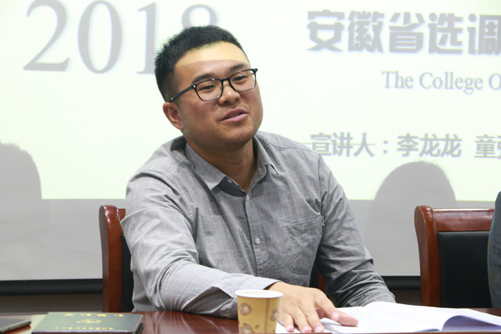 本网讯(教科院文/张鑫 图/许文齐)青年兴则国家兴、青年强则国家强。2018年全国选调生考试公告正在陆续公布中,为进一步提升我院毕业生应考备试能力,帮助毕业生成功进入基层公共部门成长成才,3月26日晚7点,我院特别邀请了专门负责选调生工作的市委组织部干部二科李龙龙(校友),在三楼学术交流报告中心进行了一场安徽省选调生培训动员会,会议由研究生会主席王申振主持。