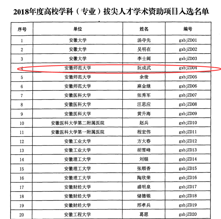 本网讯(教科院 孟庆娟)近日,安徽省教育厅下达了2018年度高校优秀拔尖人才培育资助项目的通知,我院阮成武教授入选2018年度高校学科(专业)拔尖人才学术资助项目,我校仅有三名教师入选该资助项目。