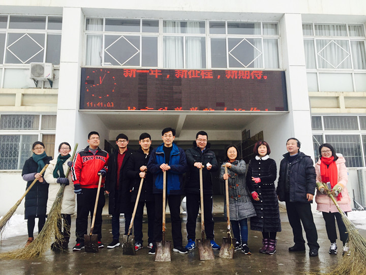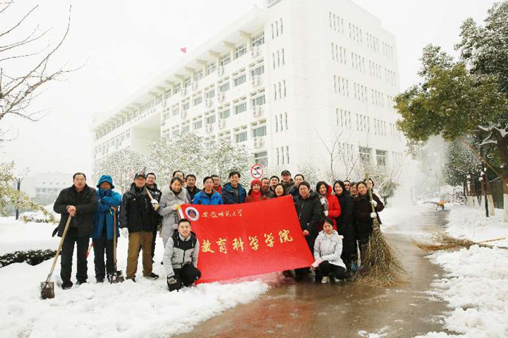 雪情就是命令,为了师生的安全出行,确保校园道路通畅,1月26日上午,院长桑青松、党委副书记张如华、副院长何海燕及部分党政干部和在校研究生冒着刺骨的寒风共同参加了赭山校区东大门到田楼后楼的三条道路的除雪除冰工作。大家齐心协力、分工明确,扫雪、铲雪、除冰…田楼外扫雪声,铲雪声、加油声响成一片,大家干的热火朝天,全然不顾天空中飘落的雪花,田楼周围呈现出一派扫雪铲冰的繁忙景象。最终,经过两个半小时的共同努力,教科院前主干道和两侧主路的路面逐渐褪去了厚厚的白色外衣,露出本来的颜色,大家疲惫的脸上纷纷露出了欣慰的笑容。