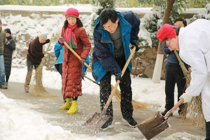 鞍马未歇,又上征程。在经历27日一整天的暴雪后,校园又披上了银装,28日一大早,我院师生二十余人在党委书记刘晓宇、院长桑青松等党政领导的带领下积极参与学校的除雪工作。银妆裹校园,扫雪树风尚。天气虽冷,积雪虽寒,却分毫不减师生工作热情,此次除雪工作持续了约三个小时,对中校区东大门-中操场-田楼东侧-田楼后楼转盘的师生主要活动区域进行了路面积雪清除。 铲除冰雪的热情高涨,团结互助的背影最美,路人们纷纷停下脚步,为扫雪大军“点赞”。参与扫雪的同学也乐在其中,认为这次清雪行动培养了大家服务校园、服务社会的精神,更发自内心地感受到助人之乐。预备党员章玲玲同学说:“工作完成后整个人身体暖暖的,是劳动之后身体发热,同时也是自己为学校做出一些微小的贡献的满足感。”