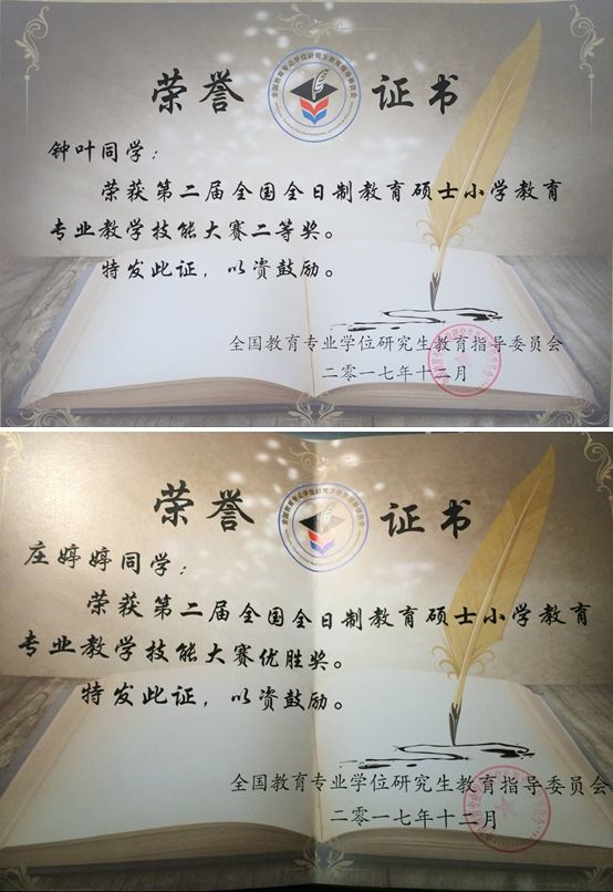 本网讯 教科院研究生 钟叶为展示全日制教育硕士的培养成果,促进院校之间的相互交流,不断提高小学教育专业教育硕士研究生的培养质量,由全国教育专业学位研究生教育指导委员会主办的第二届全国全日制教育硕士小学教育专业教学技能大赛决赛于12月14-16日在河北师范大学举行。来自安徽师范大学、北京师范大学、西南大学等国内47所高校的95名选手参加了决赛,我院2016级专硕小学教育专业研究生钟叶、庄婷婷同学在教育学系路宝利教授带领下,代表安徽师范大学参加了比赛。经过紧张激烈地角逐,两位同学表现优秀,分别荣获大赛二等奖和优胜奖,为学校和学院争得了荣誉。