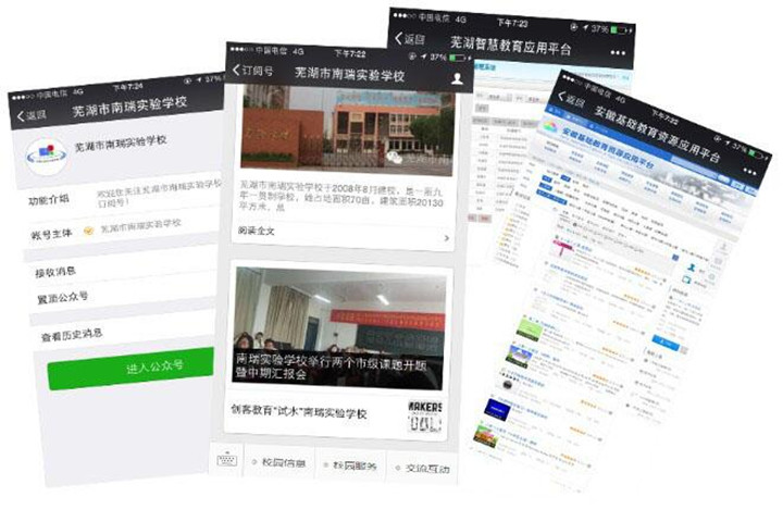芜湖市南瑞实验学校微信公众平台正式上线,该平台由在16级现代教育技术实习团队实地调研,就并就微信公众平台开发需求和方案与学校相关领导和老师进行了多次策划与交流之后,依托团队力量,整合南瑞实验学校丰富的一线教育资源,开通了校园微信公众平台,通过该平台发布校园活动信息,促进家长与学校之间的联系。同时,微信公众平台还连接了芜湖智慧教育应用平台与安徽基础教育资源应用平台,大大满足了学校教师日常工作与教学的需要,同时也为师生与家长开辟了更为便捷的交流渠道。互联网+时代,信息技术实验区指导和协助实验学校顺势而为,利用校园微信公众平台,方便家校沟通;加强校园学籍管理系统的建设,推进校园信息化整体建设的步伐,真正为师生、家长提供更加便捷、高效的校园服务!