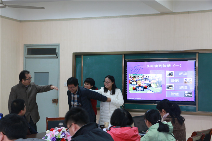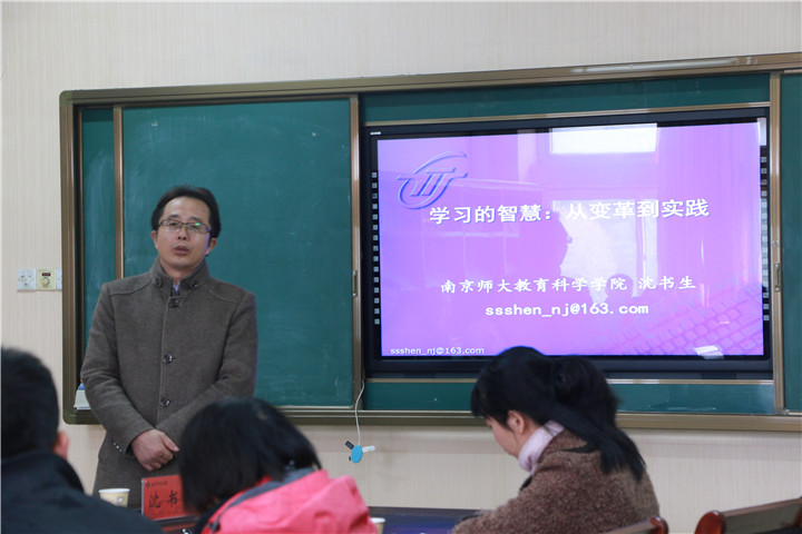 沈教授首先用江苏高考考入重点大学人数与初中人数的比例和行业最高工资与最低工资的比例这两个数字引发在场听众的思考,从而引入报告主题。整场报告沈教授从教学现实观察与思考、教到学的智慧转向、学习变革的实践角度三个方面展开,在阐述教学现实观察与思考中朱教授用最近发生的热点新闻为例并从生活开始,举出货担郎、超市和网购的销售模式的例子,将其与教育教学模式类比引发同学们深入思考,向在场听众解读教学设计中的两大误读,并根据误读给出基于描述学习效能角度的四点建议。