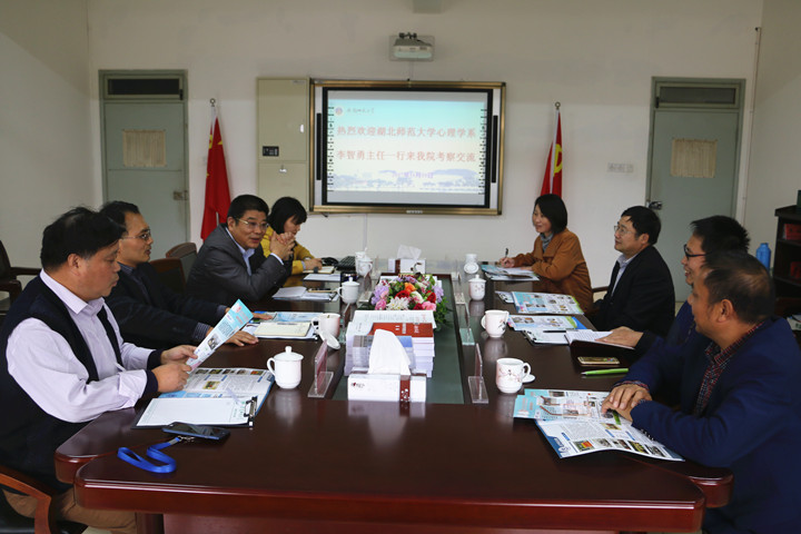 本网讯(教科院 黄引娣)11月10日下午,湖北师范大学心理学系李智勇主任一行4人来我院考察交流,院长助理周元宽,应用心理学专业负责人桂守才教授、心理学学科带头人葛明贵教授及相关职能部门负责人接待了李智勇主任一行。