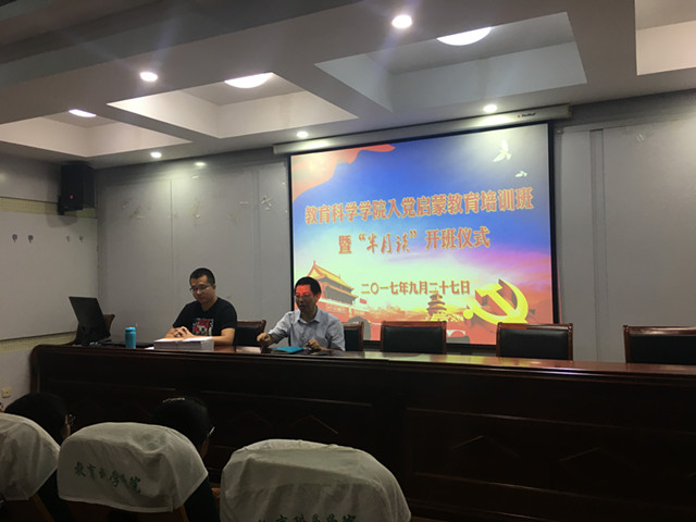 本网讯(教科院 郭俊俏 龚伟)大学新生入学为高校增添新的生机与活力、为学生党员队伍注入新鲜血液,大学新生如何在入党过程中真正做到思想和行动同入党,教科院以“半月谈”为重要载体,结合高校党建要求、新媒体发展态势、大学生特色需求,创新开办“入党启蒙教育”培训班。9月27日晚,开班仪式在学院三楼学术交流中心顺利举行。院党委书记刘晓宇、本科生学前教育专业党支部书记龚伟、2017级辅导员谭茹轩出席了本次开班典礼。参加本次大会的还有学院3位研究生驻班党员以及2017级学前教育专业本科生。