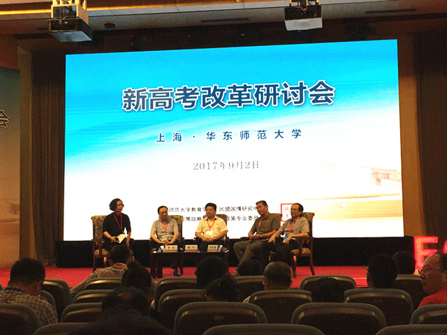 9月2日上午,由华东师范大学教育学部、民盟国情研究中心、中国教育发展战略学会教育政策专业委员会联合举办的“新高考改革研讨会”在华东师范大学科学会堂隆重召开,此次研讨会是关于新高考改革研讨的一次高端会议。研讨会在华东师大才子美女的音乐演奏中声拉开了帷幕。四位教育改革大咖上海市教育委员会副主任贾炜、浙江省教育厅副厅长韩平、江苏省教育厅副厅长苏春海、厦门大学高等教育研究院院长刘海峰等分别应邀作了《“教-考-招”联动的上海实践》《浙江新高考改革的创新探索》《江苏高考十年路》《高考改革:灵活多样与简便易行的两难》四个大会主报告。最后,四人一起登台,共同接受听众的提问。下午的“新高考改革研讨会”分四个专题进行,专题内容分别涉及增强选择性的同时如何提高学生的科学素养、高考记分和分数合成的科学性、学生综合素质评价问题、高校招生能力提升问题等。研讨内容更多聚焦在:诸如,学生的选科问题、科学素养的下降问题、走班的问题、高校的招生权力和能力问题、生涯指导问题、高校自主招生问题等等。