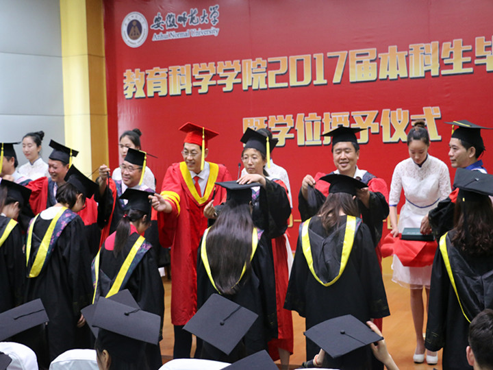 一场盛典,绵绵情谊只念薪火相传。当专业负责人宣读每一个毕业生获得学士学位决定的时候,当每一个教授委员会成员为每一个毕业生拨穗颁证的时候,当低年级同学接过毕业班同学传递的院旗时,当校友联络员接过副校长亲自授予的校友聘书时,当非毕业班同学坐在台下真心祝福学长学姐顺利毕业之时,当我们在签名墙上留下满满的祝福时,当我们高声吟唱“潜岳苍苍,江淮汤汤......莘莘多士,跻兹上痒”时,我们感受到的不仅是收获的喜悦,更是一种师大精神的传承。四年师大行,一生师大情。每一个师大人将继续秉承师大“勤学慎思、质朴谦逊、知行合一、求实求新”优良学风,砥砺前行。