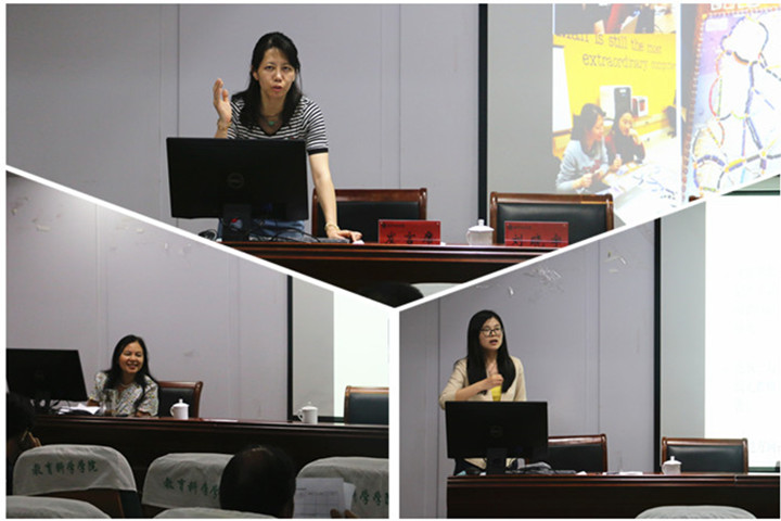 本次共六位进修访学教师进行了汇报交流,分别是到美国布莱诺大学访学的王萍和杨颖慧老师、美国约翰逊大学访学的陶佳老师、台湾暨南国际大学访学的付梅老师、台湾中央大学访学的吴文涛老师、华东师范大学访学的张丽老师。老师们通过精心准备的课件向与会教师介绍了自己所到进修访学高校的基本概况、学习生活情况、科研学术进展等,通过对各自导师专业研究方向和领域的最新研究情况的介绍,激发了教师们钻研专业的兴趣,通过介绍新形势下高等教育理念的革新措施和手段,促进了与会教师对新形势下教育科研的思考。