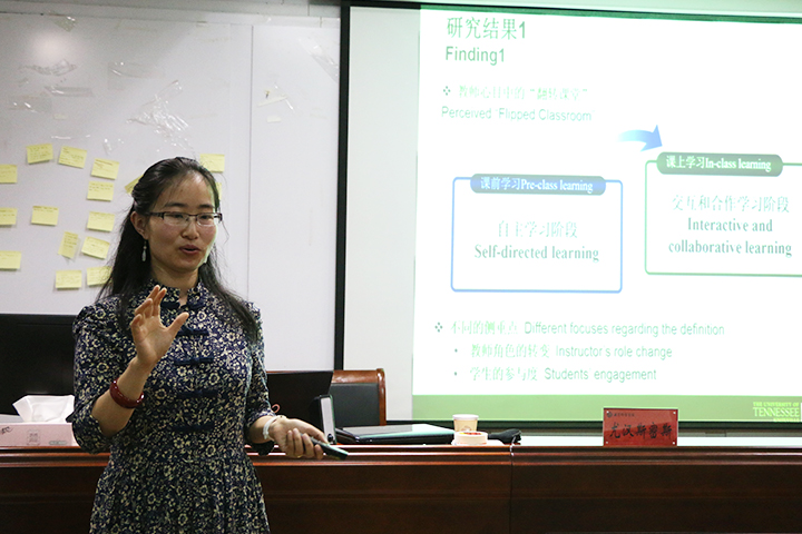 第二场报告由龙陶陶博士以“Use Flipped Classroom in Higher Education: Perspectives from Instructors”为题进行主讲。龙陶陶博士首先通过与传统课堂进行对比介绍了什么是翻转课堂,同时展示了翻转课堂现有的研究成果和缺陷,并以此分析了她的此项研究的目的。随后,龙博士对“Qualitative research”与“Quantitative research”的性质和特点进行现场提问并归纳,她建议“不同的研究情境下应当灵活采用不同的研究方法,同时可以参考研究者自身所擅长的研究方法”。接下来,龙陶陶博士从研究情境、研究对象、数据处理、研究结果等方面依次对她的研究做了详细的展示和报告,同时她提出在此项研究中发现“peer assistance”在教师使用翻转课堂时被反映为最有效的辅助方式。最后,龙博士也指出了此项研究在方法上的局限性,体现了一位优秀学者严谨的学术作风。她的报告引发了在场师生频繁的提问与讨论,龙博士一一给予了耐心、细致的解答。