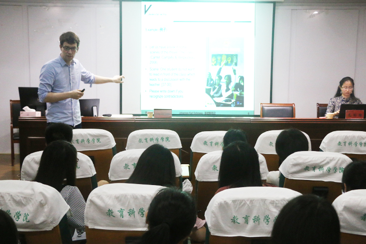本网讯(教科院 魏文静)为进一步拓宽我院研究生的学术视野,繁荣学术交流,推动学院国际化学术研究进程,我院邀请来自德国的教育博士尤汉·斯密斯与美国田纳西州大学龙陶陶博士于2017年6月8日上午在三楼学术报告厅,以“成为一名优秀教师的要求与解决方案”为主题,分别为学院师生连续带来两场精彩的学术报告。报告会由学院副院长李宜江教授主持,学院相关研究领域的教师以及全体16级教育学专业研究生到场聆听。