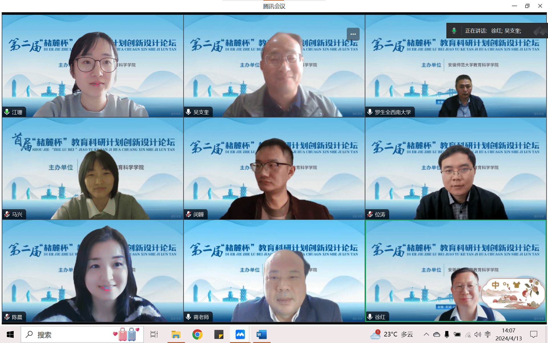 2024年4月13日-14日,365英国上市官网第二届“赭麓杯”教育科研计划创新设计论坛如期举行。学院特邀南京大学陈友华,北京师范大学马健生,华东师范大学刘俊升,华中师范大学任志洪,西南大学徐辉、罗生全,南京师范大学沈书生,西北师范大学郭炯,广西师范大学蒋士会等知名专家线上指导。