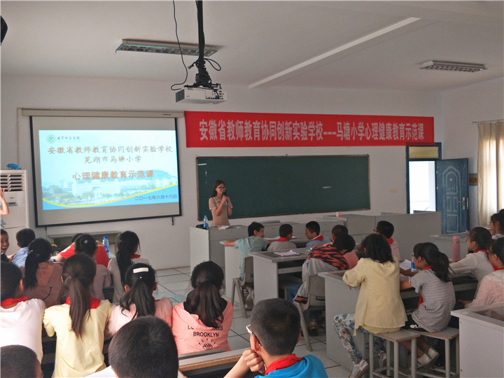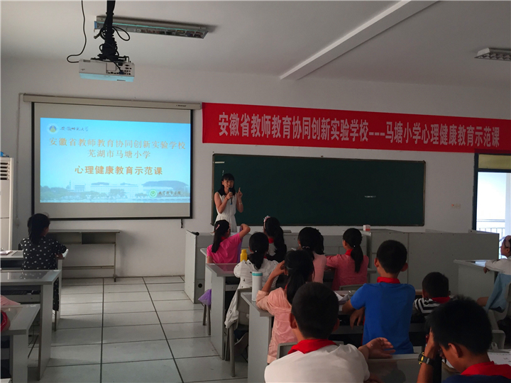 本网讯(教科院 孟庆娟)6月16日下午,安徽省教师教育协同创新中心实验学校马塘小学举行心理健康教育示范课活动,在心理健康教育实验学校首席专家方双虎教授的指导下,教科院2015级研究生曹晓芹、朱雨雁分别给五、六年级学生上了两节生动精彩的心理健康教育课——《唠叨你hold住了吗?》、《我的情绪我做主》。