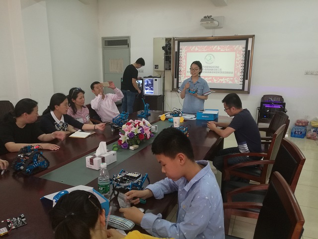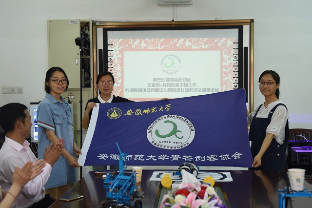 随后,张如华向青芒创客协会进行授旗。青芒创客协会的会旗由两个“C”组成芒果的形状,以青绿色为底色。寓意为“青年创客,展现锋芒”。社团代表对创客课程、科技产品进行了详细的介绍,来参加此次会议的学生进行了小车组装、操作体验,现场感受创客的乐趣。