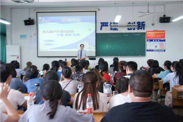 丁教授通过价值、趋势、构想三个方面对幼儿园户外游戏活动进行了简要概括,通过提出开展户外游戏活动的政策依据、学理依据、专业依据,用他诙谐幽默的语言讲解了户外游戏的主要特点、实施要略、实践意义。课上播放的视频短片生动、形象的展示了幼儿园户外游戏的重要性,深刻的指出了户外游戏在孩子身心发展过程中的重要价值。最后,朱立新进行总结,强调户外游戏是幼儿教学中不可小觑的重要组成,并希望每一位教师可以扎根教育,不断给予祖国的花朵最丰盛的养料。