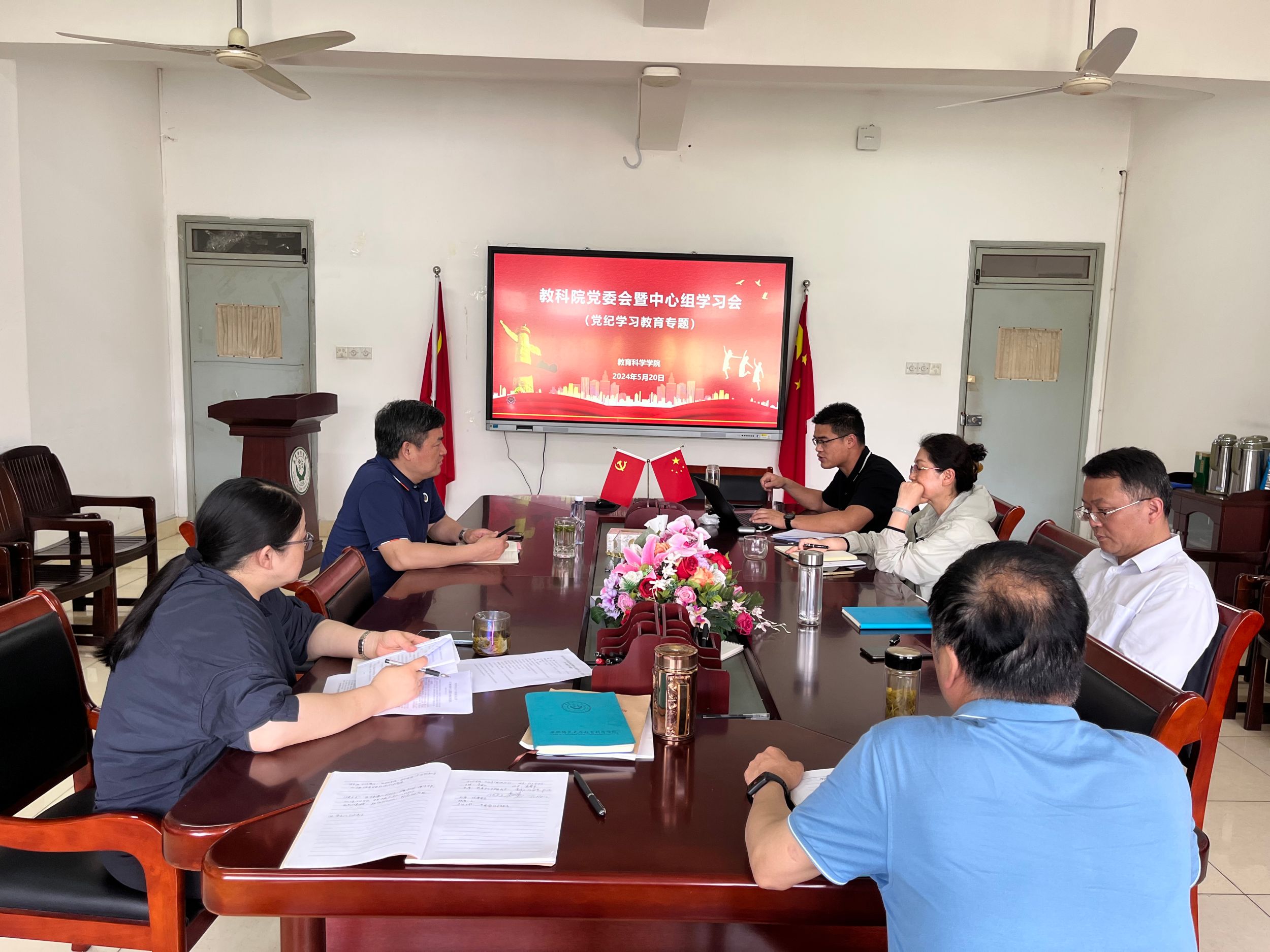李宜江在主持会议时强调,开展党纪学习教育是一项政治任务,在坚持学院高质量发展的同时要守住安全底线,全院上下要坚持原原本本学,将《条例》学习切实融入到党委理论中心组学习、支部“三会一课”学习中,通过集中学习、个人自学、典型引领、警示教育等多种形式推动《条例》学习入脑入心;要坚持党纪学习教育与实际工作相结合,进一步把党的自我革命重要思想贯彻到实践当中,在“照镜子、找问题”中学纪、知纪、明纪、守纪,班子成员要不断警醒也要相互提醒,确保党纪学习教育取得实实在在成效。