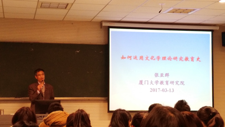 本网讯(教科院 尚梦生)时值春意盎然之际,应我院邀请,厦门大学教育研究院张亚群教授于3月13日上午,在田楼8607教室,给我院广大本科生和研究生倾情奉献了一场题为“如何运用文化学理论研究教育史”的学术讲座。