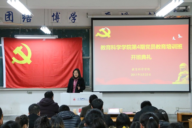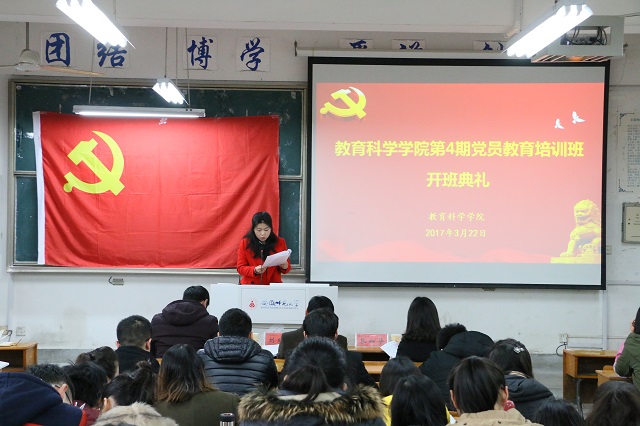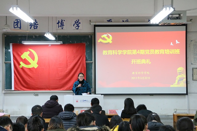典礼在雄壮嘹亮的国歌声中拉开帷幕,莫大贡向学员们宣读了学院党委《关于举办我院第4期学生党员教育培训班的通知》并强调了纪律要求,要求全体学员严守规章制度,认真撰写心得体会。随小莉介绍了培训班的的教学活动计划安排。要求学员们认真听讲,投身实践,不断加强理论学习和党性锻炼。随后本期党校培训班班长、2014级心理学专业本科生罗艺茹同学代表全体学员发言,她表示,作为新时代的大学生党员,要以最饱满的热情,最实际的行动来完成党课学习,努力成为一名合格共产党员!