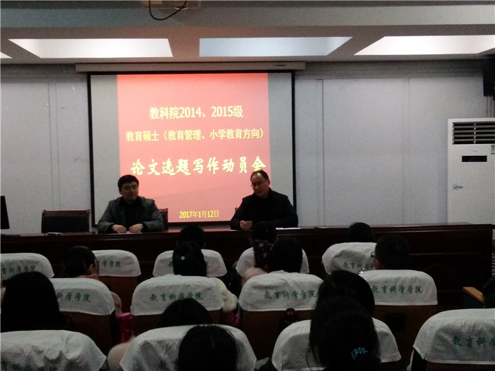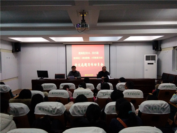本网讯(14教管 桂学鑫)为规范教育硕士专业学位论文写作,提高学位论文质量,1月12日下午,教育管理、小学教育学位方向在院三楼学术交流中心召开14、15级在职教育硕士论文选题写作动员会。副院长、教育管理方向负责人李宜江教授,小学教育方向负责人吴支奎副教授出席会议,全体14级、15级教管、小教专业教育硕士及部分其他专业共计80多人参加会议。