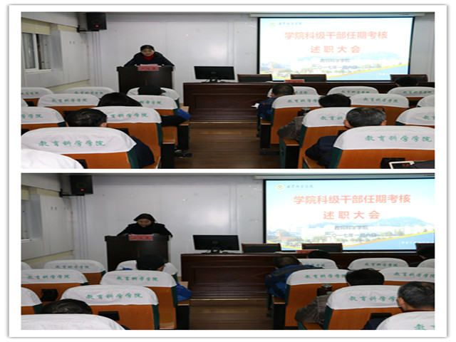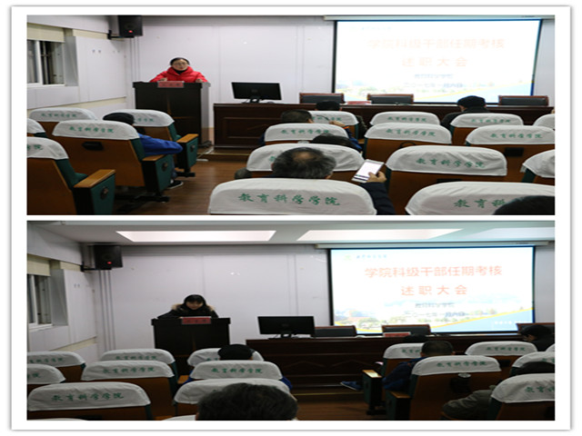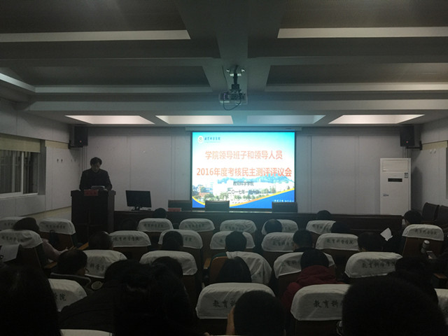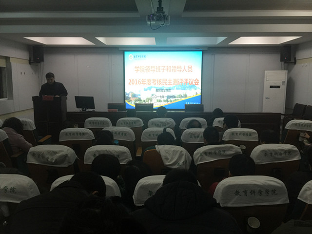 首先进行的是学院中层领导干部述职。刘晓宇在主持中指出中层述职是学校对学院进行绩效考核工作的重要一环,目的是总结成绩,查找问题,进一步做好今后的工作,有利于让全体教职工了解中层领导的履职情况以及对学院发展所作的贡献、并进行客观真实的评价;有利于增强上下之间、彼此之间的沟通、交流与理解,进一步提升教职工队伍的向心力;有利于促进中层管理人员提升执行力、领导力,进一步增强责任感、事业心,凝心聚力推动学院的发展。院长桑青松代表学院领导班子向全院教职工就2016年学院工作进行了总结,他指出2016年教科院发展成绩突出,涌现了十大亮点:院党委获安徽省先进基层党组织称号、两门教师教育课程入选首批国家精品资源共享课、获得全省师范生技能大赛(学前组)特等奖1项、2014级学前本科班获全国高校“活力团支部”、获得全国教育科学研究优秀成果二等奖1项、CSSCI及以上级别论文发表32篇、建成安徽省首个教育硕士案例库与推广中心、发布安徽省首个《教师教育发展年度报告》、完成了安徽省教师教育创新实验区学校办学质量第三方评估、学院设立基金50万元实施人才引进工程。其他中层领导干部结合自己分管的工作从德、能、勤、绩方面向全院教职工汇报了自我的履职情况。中层领导干部的述职不仅展现了他们的工作风采,同时也充分展示了一年来学院在党建、教学、科研、学生管理、社会服务方面取得的丰硕成果,令全院教职工振奋不已。