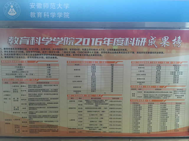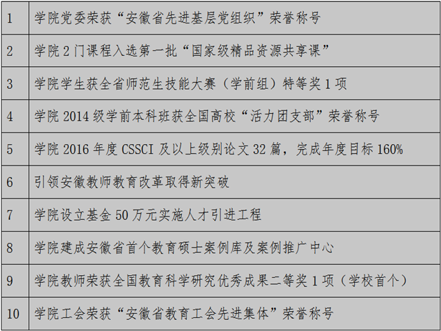 2016年度,学院发布我省首个《安徽省教师教育发展报告(2014-2015)》,完成了全省29所中小学办学质量第三方评估,实现了引领安徽省教师教育改革的新突破。