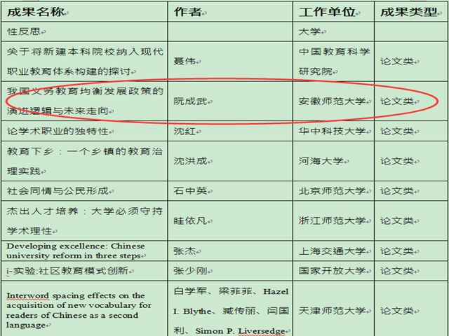 在第五届全国教育科学研究优秀成果奖评选中学院阮成武教授的论文获优秀科研成果二等奖。这是继2006年学院朱家存教授的《教育均衡发展改革研究》、姚本先教授的《儿童心理辅导》获得第三届全国教育科学研究优秀成果(著作类)三等奖后,学院首次获得此项最高奖励。