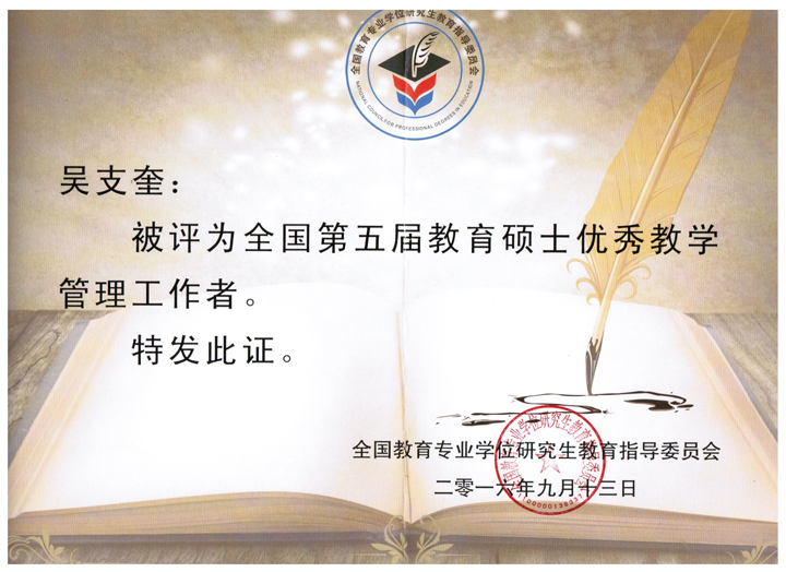 (本网讯 过婴宝)在全国教育专业学位研究生教育指导委员会举办的第五届教育硕士优秀教师和教学管理工作者评选活动中,我院小学教育学位点负责人、硕士研究生导师吴支奎副教授荣获“优秀管理者”荣誉称号,这是我院在教育硕士培养方面荣获的又一殊荣。
