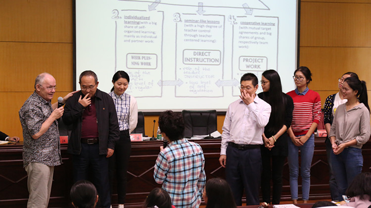 第一场报告由迈尔教授主讲“学生积极参与的教学方法”。迈尔教授首先同艾拉教授现场开展了一个别开生面的“教授间的互动”问答案例,以此表现出互动对教育的重要作用,提出加强课堂教学方法多元化的观点。随后,迈尔教授简单介绍了自身的学术背景以及对教育工作的热爱,他为教育奉献终身的优秀品质引来在场师生的热烈掌声。迈尔教授从课堂教学方法概念阐述,从如何打破教师固有教学方法、更新教学观念,当前主流的课堂教学方法和开展实验性课堂教学互动体验四方面为大家呈现了课堂教学的理论和实践。在互动阶段,数位老师和同学受邀上台与迈尔教授进行了互动教学体验,迈尔教授列举的精彩案例及幽默风趣的语言表达也令全场掌声不断。最后迈尔教授强调,教学方法使用的深度要比教学方法多样性更重要。在实际的课堂教学中,应混合使用多种教学方法、达到方法之间的彼此融通与平衡。