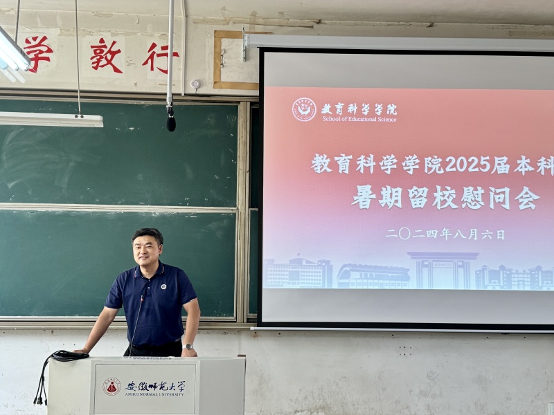 为贯彻落实大学生护航行动计划,增强暑期留校学生的备考信心,8月6日下午三点,365英国上市官网于田楼8102教室召开2025届本科生暑期留校指导慰问会。教科院院长李宜江、党委副书记杜凤、副院长韩建涛、心理学专业负责人王礼军、学前教育专业负责人王成刚、小学教育复合型专业班主任肖龙、2025届毕业班辅导员张理强、赵茜及全体暑期留校学生参加。会议由赵茜主持。
