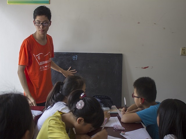十点半左右,书法课程正式开始。今天的书法课程由队员宋国健开展,学生响应强烈。“横要稍斜,竖要畅;长横有弧,短横粗……”,根据队员宋国健的指导,孩子们在自己的练习纸上一笔一划的写着。虽然一天的学习不能让孩子的汉字书写水平得到很大的提升,但是他们认真的样子让队员们有理由相信:未来,他们都会书写一个个灿烂的人生。