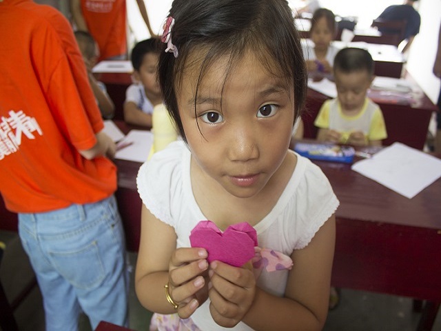 早上九点整,在完成日常的课业辅导以后,队员们给低年级的孩子们安排了手工折纸课,每个孩子都折得很认真。经过队员们的耐心示范与讲解,一个个纸折的爱心就这样在他们手中出现。看到他们学会折爱心后露出的灿烂笑容,队员们感到十分欣慰。