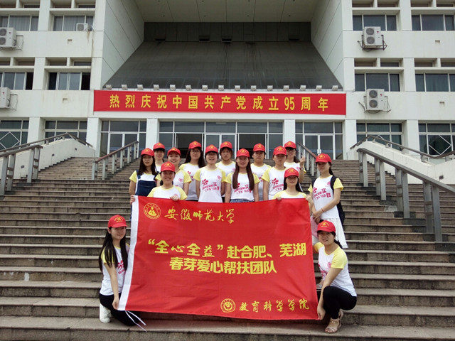本网讯(教科院 夏姝娴 韩 婷)“爱暖春芽,全心守候。”在地球上有一群星星的孩子,有一群折翼天使。他们或性格孤僻,或少言寡语;他们有着和我们不一样的来自于浩瀚星空的特殊思维;他们比我们承受了更多的来自世界的不幸与痛苦。而芜湖春芽特殊儿童发展中心为这群孩子撑起了一把保护伞,他们在这里变得越来越好。为深入学习贯彻党的十八大,十八届三中、四中全会精神以及习近平总书记系列重要讲话精神,引领青年大学生“了解社会,坚定信念”、“服务社会,增长才干”、“深入基层,虚心学习”和“安全实践,做好总结”,安徽师范大学教科院2014级学前教育专业的学生们组织了“全心全益”赴合肥、芜湖“爱暖春芽”院级重点实践团队,目的是帮忙照顾这些有心智障碍和自闭症的孩子,爱心帮扶春芽特殊儿童发展中心。